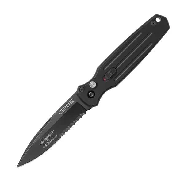 The Gerber Mini Covert automatic knife is 6.50 in. overall length with a 2.80 in. black S30V steel blade. 3.80 in. black hard anodized aluminum handle. Comes complete with a black pocket clip.