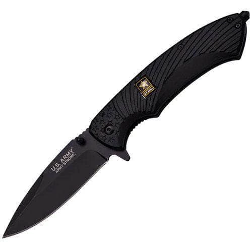 Officially Licensed US Army Spring Assisted KnifeThis US Army Tactical Knife is designed right here in the US of A and licensed officially from the US Army. It is very sharp, sharper than most factory made knives, and this design was prototyped and sent to the US Army branch for approval before making into production. Just the blade alone is 3.5 inches long, and is a fine edge the entire length of the blade. It features a pocket clip as well, for easy handling, along with a thumb stud to assist in deployment. The Army Tactical Knife Serrated is part of the Stars & Stripes lineup of tactical knives, focused on American design and official distribution. Army Strong*Must be 18 years or older to buy*Specifications Overall Length: 8.6 Inches Blade Length: 3.5 Inches Blade Material: Strong Stainless Steel Alloy Blade Thickness: 3mm Deployment: Folding, Spring Assisted Sharpness & Functionality: Extremely Sharp, Highly Functional Blade Features: Drop Point, Fine Edge, False Upper Edge Spine Handle Length: 4.75 Inches Handle: Aluminum Handle, Black w US Army Logo Tactical Features: Carbide Glass Breaker, Thumb Stud, Pocket Clip Also Includes: Extra Hardware Set, Box w License Info Finish: Black Coated Blade, Black Handle